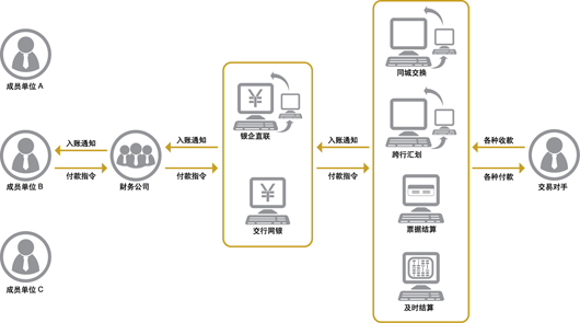 对于财务公司要集中管理下属成员单位资金的需求,成员单位同时在财务公司及交通银行开立结算账户,一一对应,通过人民币现金池,我行提供基于不同账户结构的多种资金归集模式的解决方案。
